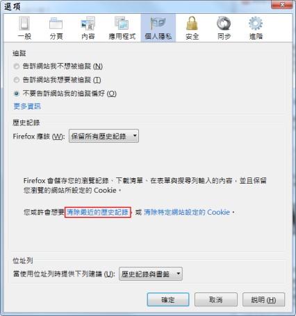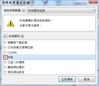 Firefox清除方式:[功能表選單]→[選項]→[個人隱私]→點擊[清除最近的歷史紀錄]→勾選[快取]→[立即清除]