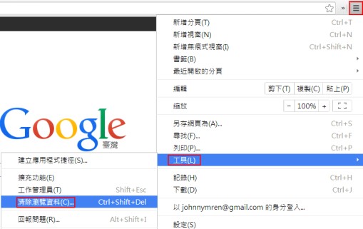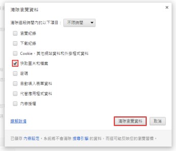 Google Chrome清除方式:點擊[自訂及控制 Google Chrome]按鈕→[工具]→[清除瀏覽資料]→勾選[快取圖片和檔案]→[清除瀏覽資料]
