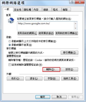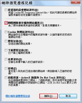 Internet Explorer清除方式:[功能表選單]→[工具]→[網際網路選項]→[刪除(D)]→勾選[網際網路暫存檔與網站資料]、不要勾選[保留我的最愛網站資料]→[刪除(D)]