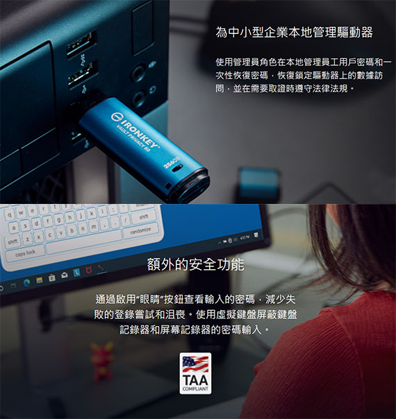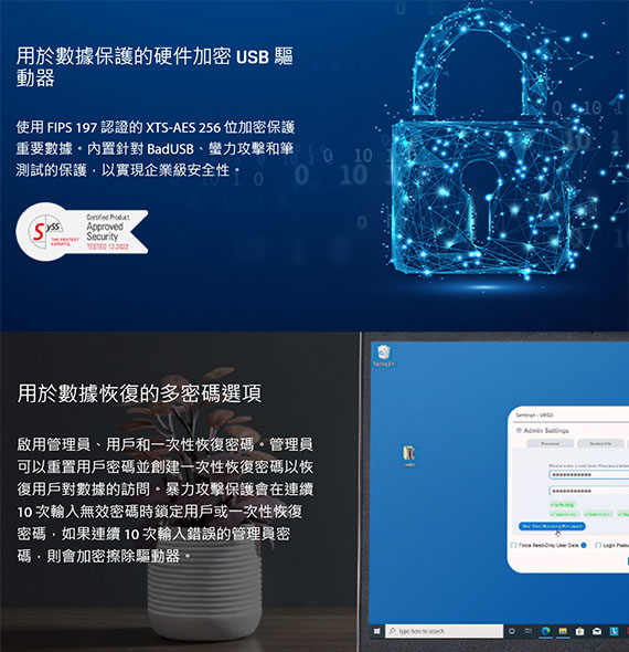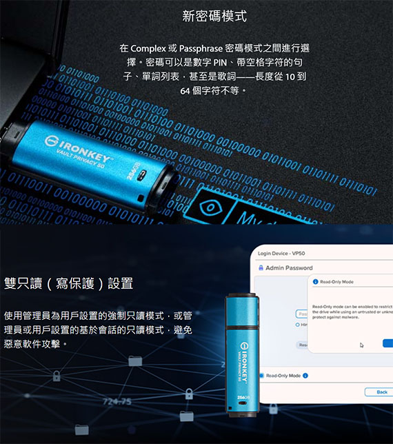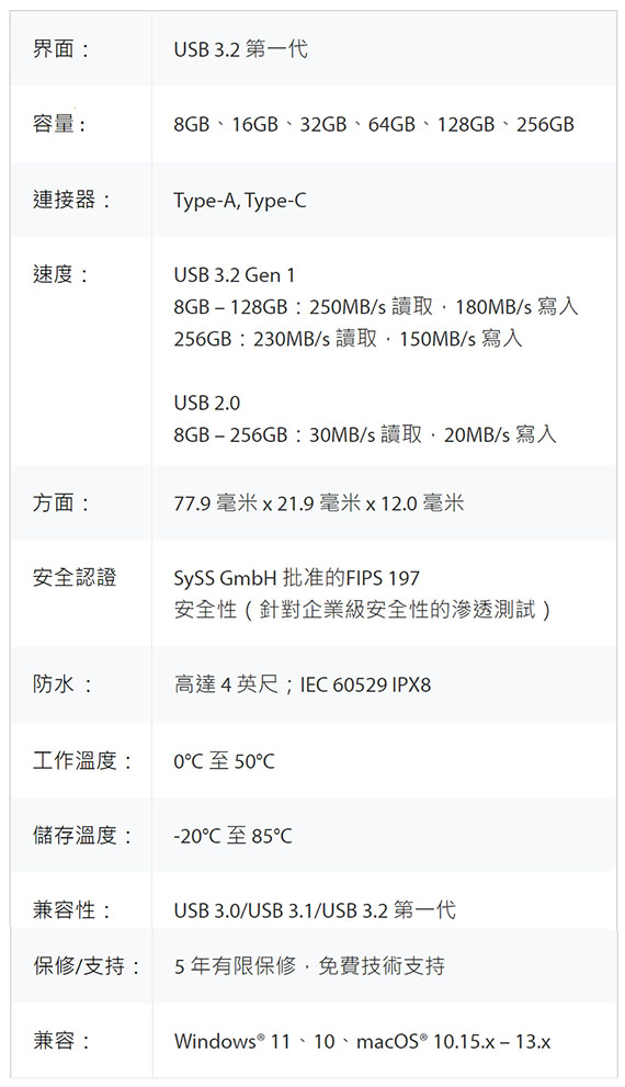 ![]() 【商品介紹】 金士頓 IronKey Vault Privacy 50 系列 用於數據保護的 FIPS 197 認證和 XTS-AES 256 位加密 USB 驅動器