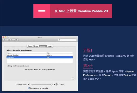 在多功能性與靈活性的結合中,Creative Pebble V3 可以通過 USB-C 或電源適配器供電,並通過各種連接選項進行設置!它還具有 3.5 毫米 AUX 輸入插孔,可實現其他模擬音頻設備的通用兼容性。 ![]() ![]() ![]() *不包括 AUX-in 電纜和電源適配器 Creative Pebble V3 是即插即用設備,不需要安裝驅動程序。 對於 PC 用戶,插入 USB 數據線時會自動檢測 Creative Pebble V3。如果您的 PC 連接了多個音頻設備,您還可以在“聲音”設置中手動選擇 Creative Pebble V3 作為默認輸出揚聲器。 對於 Mac 用戶,還有一個步驟需要執行: ![]() 提升以獲得更好的音頻