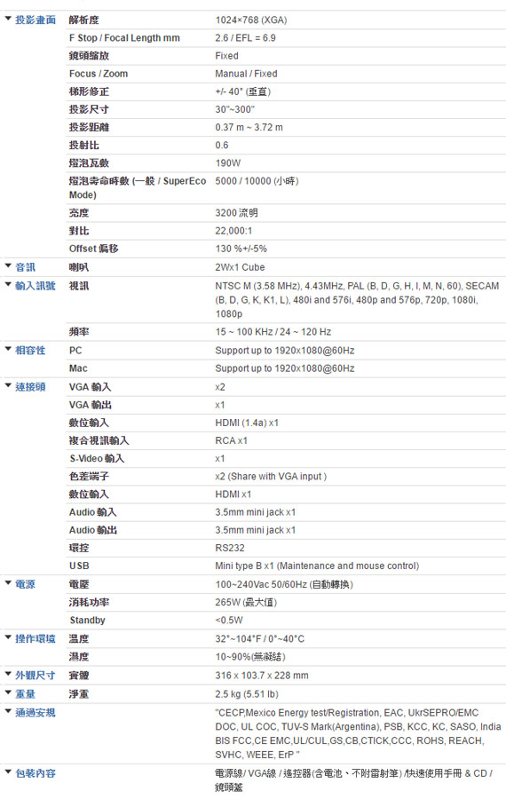 ![]() ![]() 3,200流明XGA 短焦光艦投影機